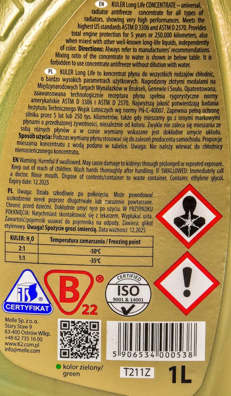 Антифриз-конц. зелений K2 "Kuler Conc. GREEN", 1л- новітнє покоління універсальної охолоджуючої рідини для систем охолодження двигунів автомобіля з високими експлуатаційними характеристиками. Забезпечує повний захист двигуна протягом 5 років без обмежень по пробігу, також у разі змішування з іншими охолоджуючими рідинами з збільшеним терміном служби, незалежно від їх кольору. Підходить для використання у всіх типах радіаторів, в тому числі алюмінієвих. Повністю відповідає найсуворішим американським стандартам ASTM D 3306 і ASTM D 2570. Найвища якість KULER Long Life -80°C підтверджено Сертифікатом Відповідності з нормами PN-C-40007 виданого Інститутом автомобільного транспорту у Варшаві на основі випробувань в Технічному Інституті Військово-Повітряних Сил. Інноваційна рецептура охолоджуючої рідини KULER LONG LIFE була удостоєна золотої медалі на Міжнародній виставці інновацій, наукових досліджень і нових технологій БРЮССЕЛЬ INNOVA 2009, в Сеулі 2009 і в Женеві 2010.